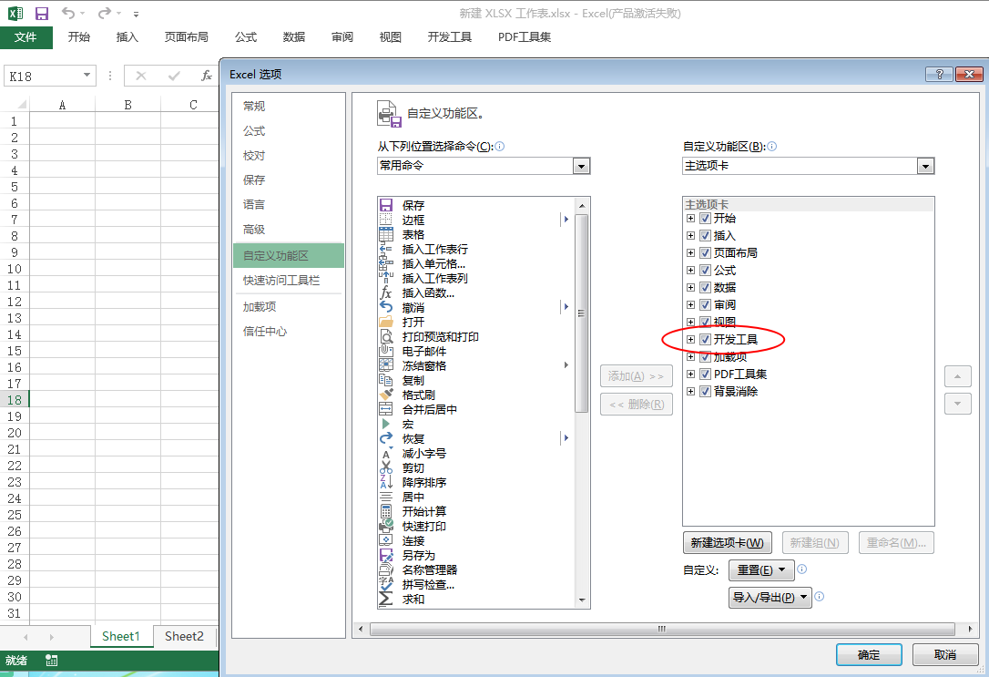 1、在excel选项自定义功能区中:如果没有开发工具这个选项,那么从左侧找到它,然后添加到右面