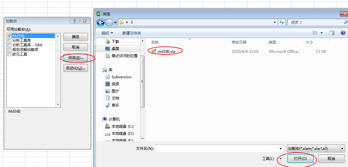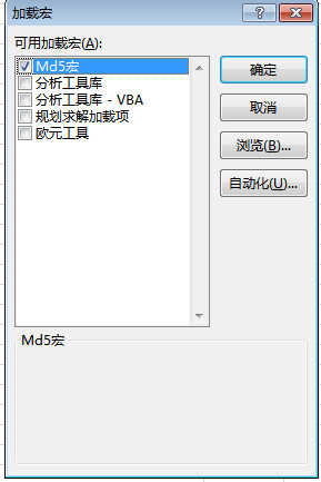 使用完md5宏后要将宏关闭,将√勾掉,否则打开excel时会提示右侧的md5计算器